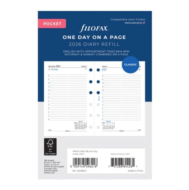 Anglický kalendář 2026 den na 1 stránku pro diáře Filofax o velikosti Pocket - kapesní. Sobota a neděle jsou na 1 straně. Formát papíru 120 x 81 mm.